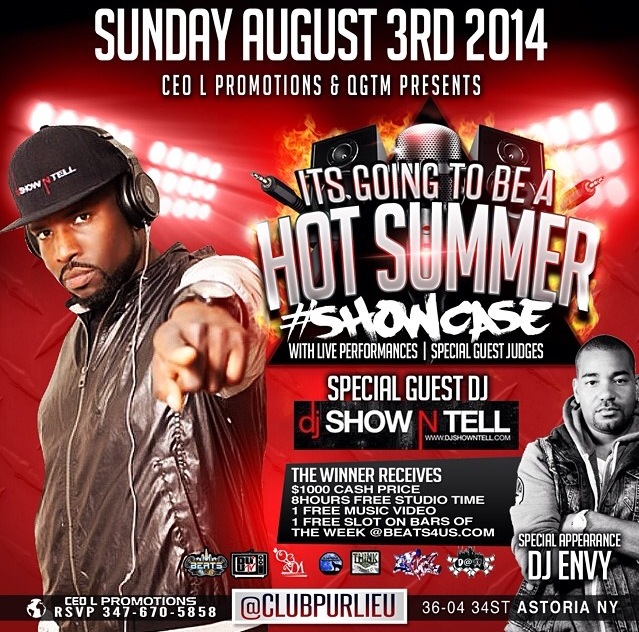 Sunday August 3rd “It’s Going To Be a Hot Summer Showcase” @ Club Purlieu with music by Dj Show N Tell and Hosted by Power 105 Dj Envy. Featuring some of he dopiest upcoming artist in NYC. Club Purlieu – 36-04 34th st Astoria, Ny. See You There !!!